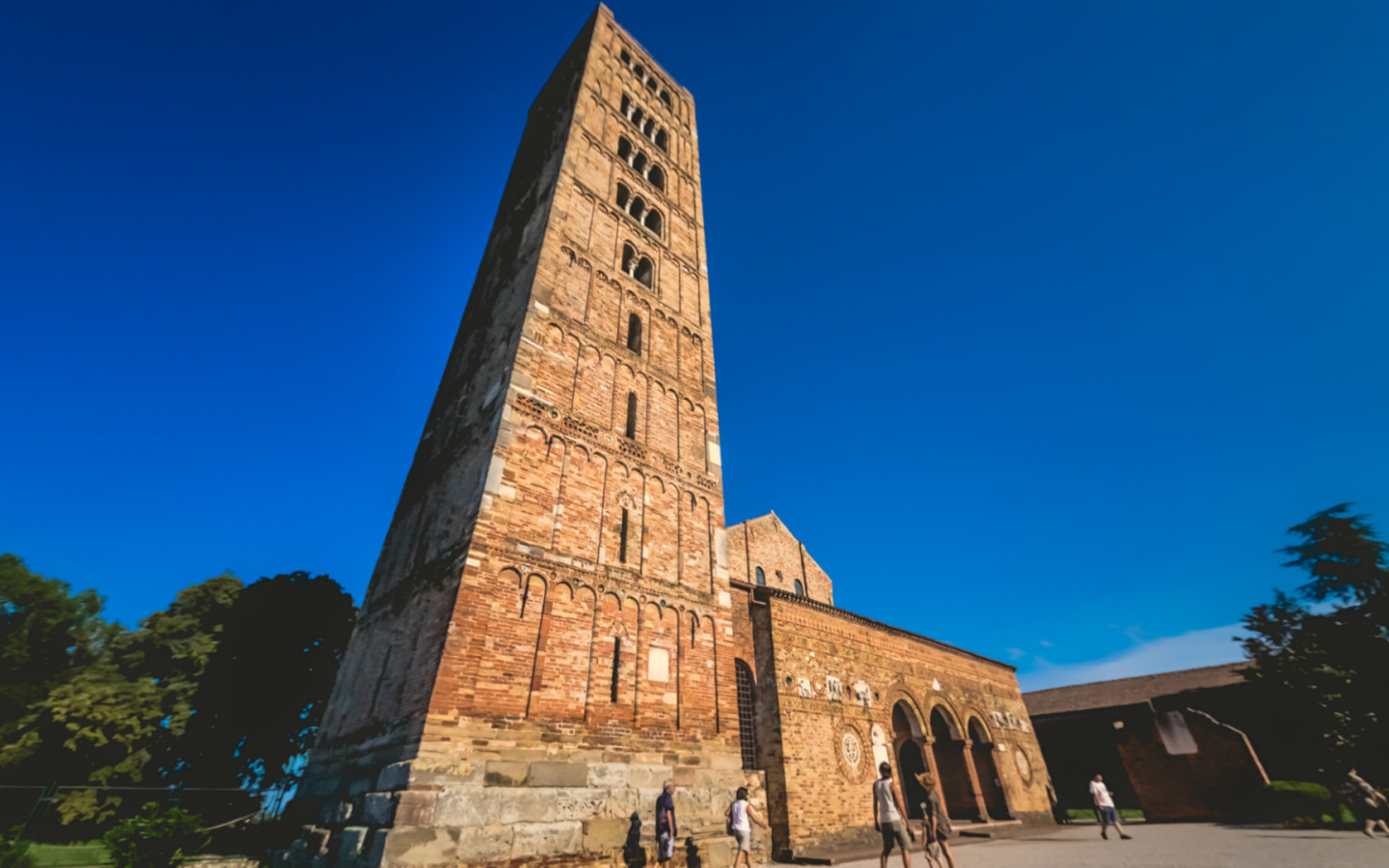 Capolavoro dell’arte romanica, l’abbazia si riconosce da lontano col suo alto campanile, con la sua semplice facciata preceduta da un portico riccamente decorato in cotto e marmo e dal suo caldo colore rossastro del laterizio; sorta su quella che nell’antichità era un’isola (insula Pomposia) circondata dalle acque del Po di Goro, del Po di Volano e del mare, l’abbazia è stata, durante il medioevo, una delle più importanti del nord Italia quando da dopo l’anno mille divenne un fiorente centro di cultura grazie all’ordine benedettino, ai suoi monaci amanuensi e alla vasta biblioteca.