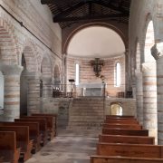 Sul presbiterio sopraelevato si trova l’altare maggiore la cui parte anteriore è costituito da un palio marmoreo con croce greca a otto bracci affiancata a due croci latine di provenienza greca, risalente al VII secolo; sotto il presbiterio si trova la cripta divisa in tre piccole navate sostenuta da basse e snelle colonne i cui capitelli hanno caratteristiche simili a quelli della chiesa.